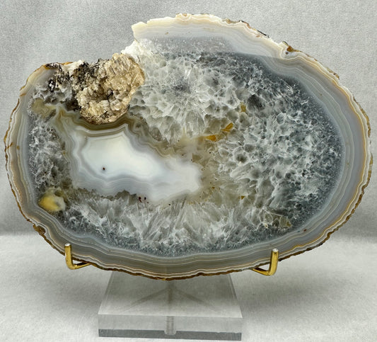 Introducing Our One-of-a-Kind Grey Lace Agate Slab with Calcite Deposit Prepare to be captivated by...