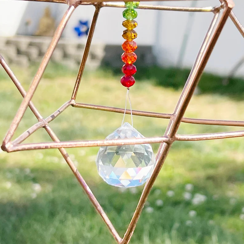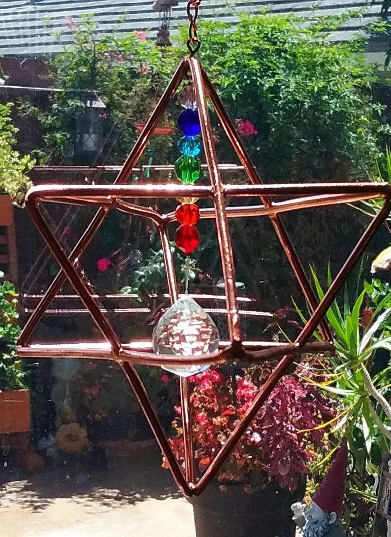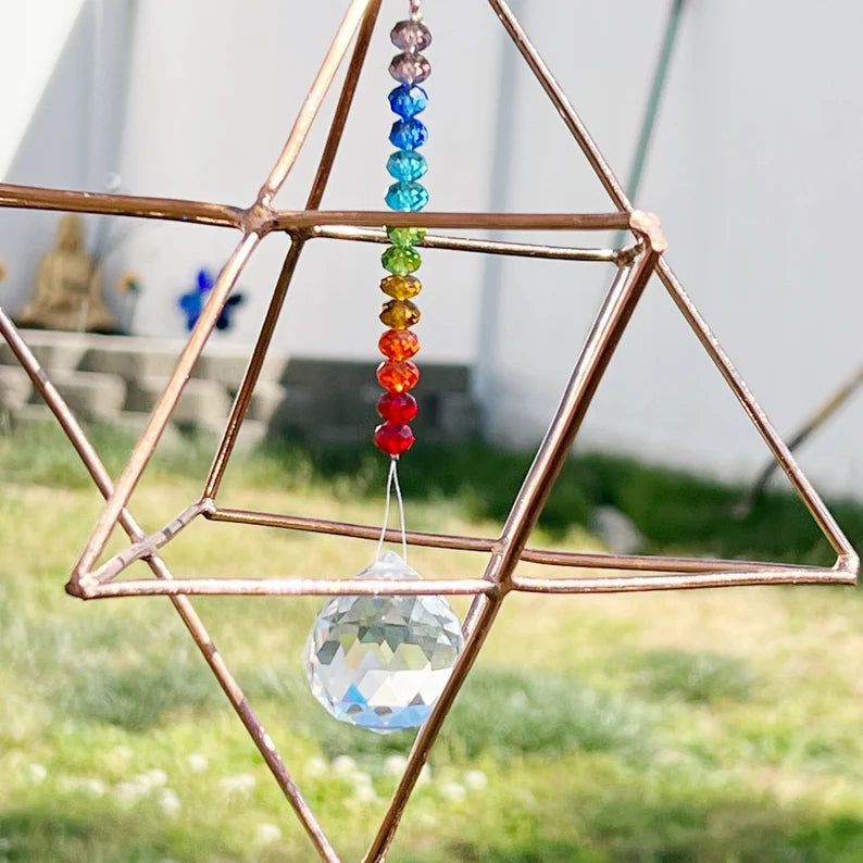 Make your meditation and spiritual practices even more powerful by incorporating the energies of the Merkaba and the chakra crystals. This energizer serves as a focal point, helping you connect with your higher self and the universe. This hanging copper Merkaba has in its heart a lovely cut crystal prism from Austrian glass connected by a series of faceted glass beads to a tiny hook at the top of the Merkaba. Hang it near a sunny window to let the sun energize and reflect around your sacred space. You can also hang pendulums, talismans, and other items within to energize them.