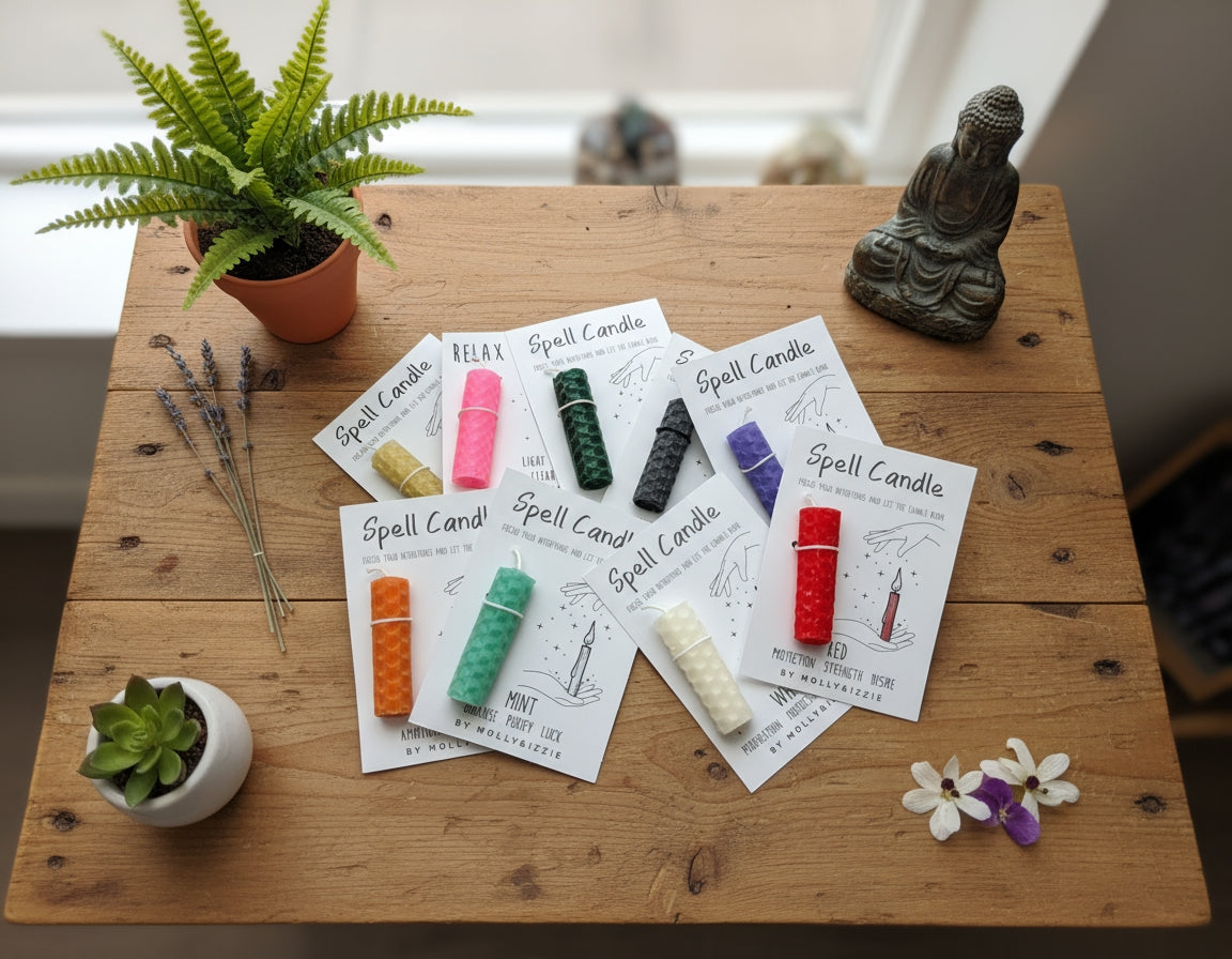 Please Note: Our beeswax spell candles are sold as spiritual tools intended to support personal practice. We make no claims of medical, financial, or guaranteed outcomes. Never leave a burning candle unattended. Keep away from flammable objects, children, and pets. Place on a heat-resistant surface and trim wick before each use for best results. Any items shown in photos aside from the candle itself are props and are not included with purchase.