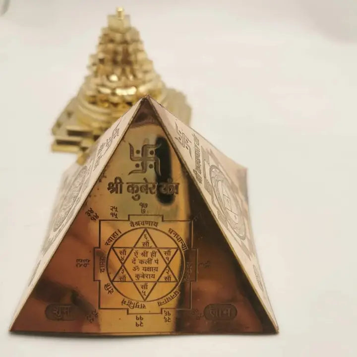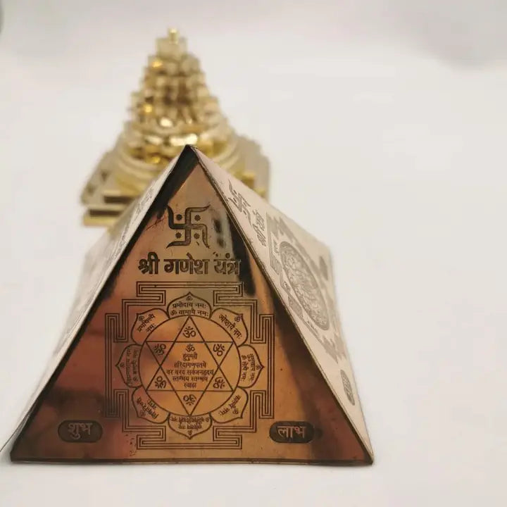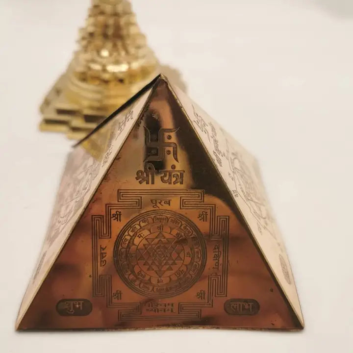 Our Copper Pyramid Yantra is a meticulously handcrafted spiritual tool, forged from 100% pure copper and etched with a powerful combination of Shree Yantra, Shree Ganesh Yantra, Shree Kuber Yantra, and Kanakdhara Yantra symbols. Standing approximately 3 in (7.6 cm) high and hollow with an open base, this yantra is designed to amplify energies and for strengthening intent, aligning aura, and balancing environments according to Vastu principles.