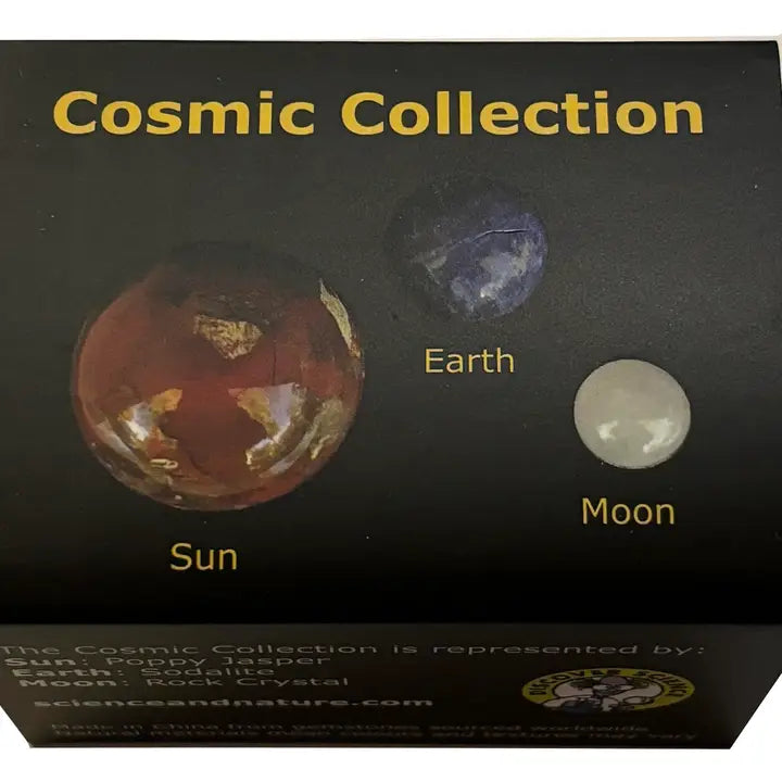 Bring the cosmos to your desk with this enchanting set of polished gemstones representing the Sun, Earth, and Moon. Each piece is thoughtfully chosen for its beauty, symbolism, and energy, creating a celestial display that inspires and uplifts.