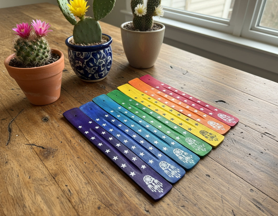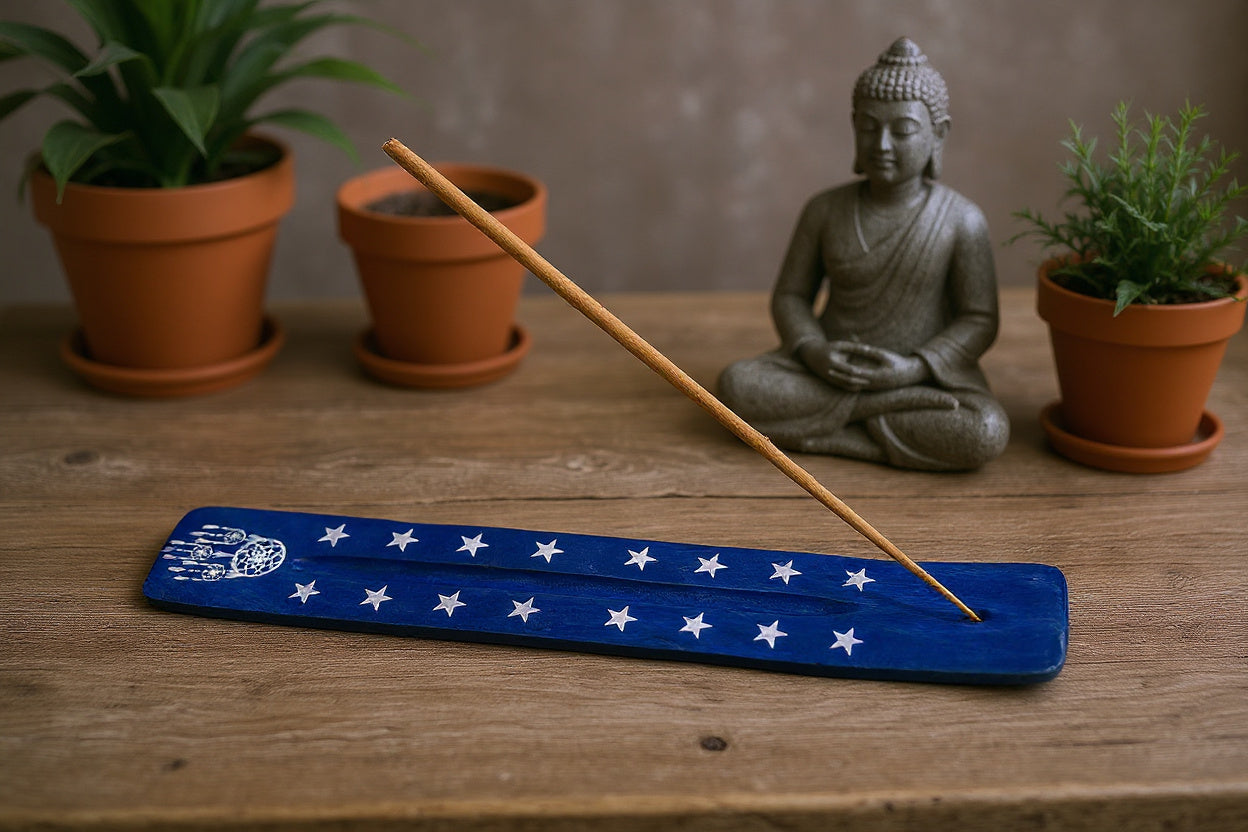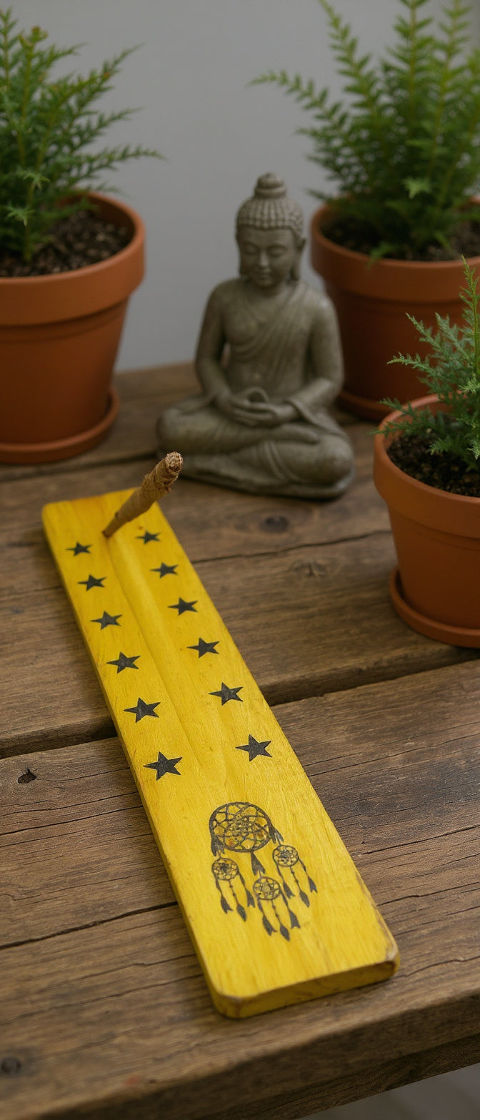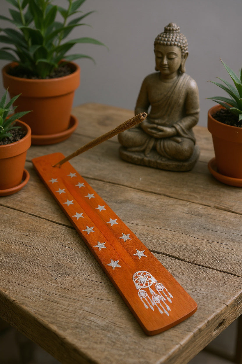 The slim silhouette sits low and steady on altar, desk, or windowsill. Light your favorite stick, choose the color that matches the chakra that you want to invoke, and feel the room shift toward clarity and calm. Because each holder is handmade, subtle variations in grain and tone make yours one of a kind. Handmade mango wood with a smooth, comfortable finish that’s easy to wipe clean. The dream-catcher design that feels both modern and meaningful. A balanced channel and stick angle that help capture ash neatly. Sized to work beautifully with most standard incense sticks.