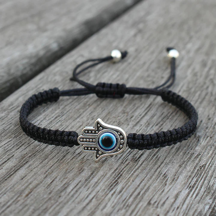 This is a hand woven bracelet with a silver Hamsa and an evil eye inside. The bracelet is completely adjustable to fit perfectly. Hamsa symbolizes harmony and protection against the evil eye, which is the sum of evil forces in the world.