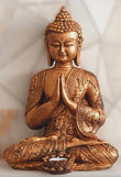The statue features a seated Buddha in a serene meditative pose, finished in a radiant golden hue that evokes feelings of peace and positivity. The thoughtfully designed tealight holder nestled in the Buddha’s hands adds a soft, soothing glow, perfect for meditation, relaxation, or setting an ambiance of warmth in any room.