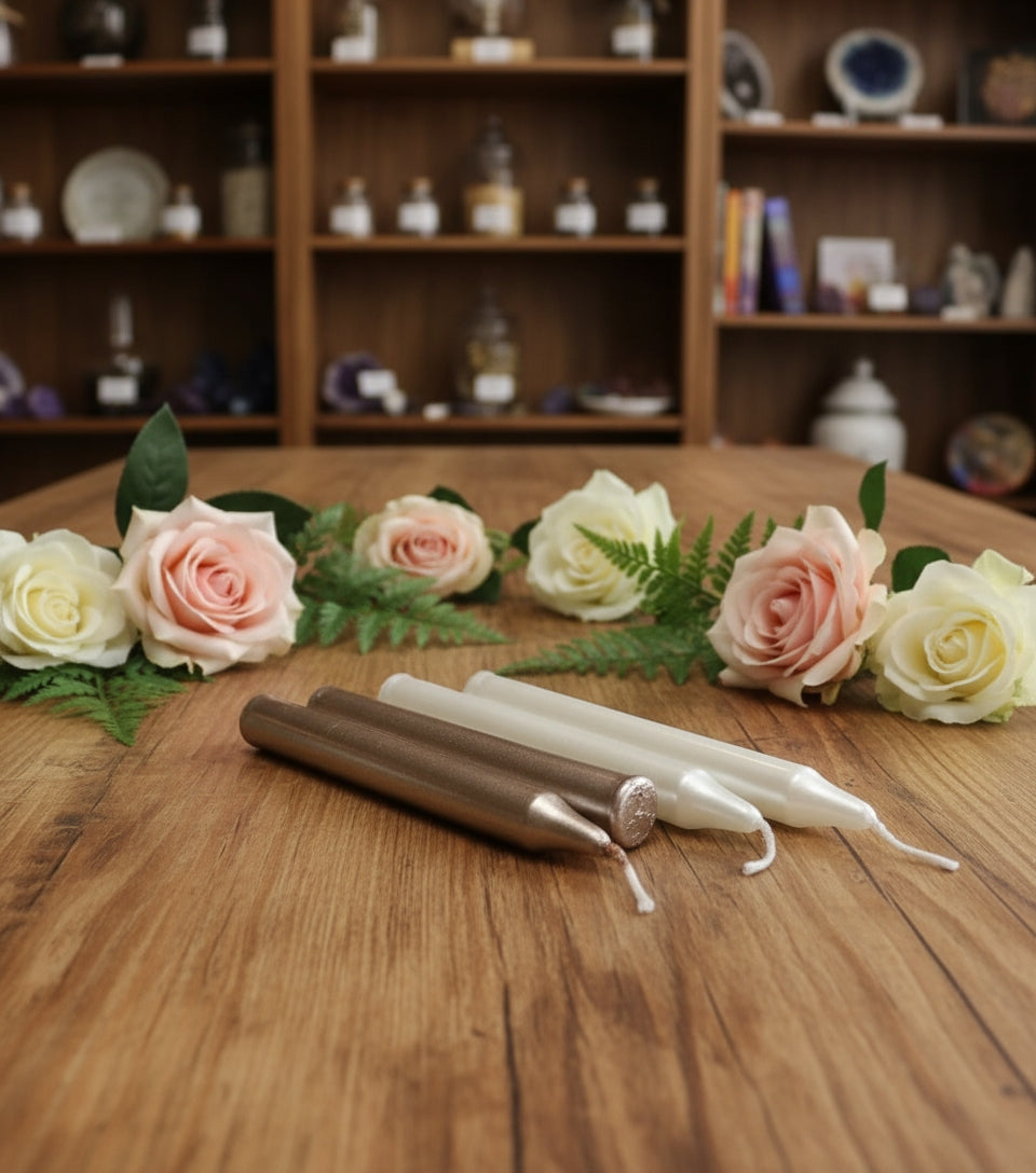 Each candle gleams with a metallic finish, reflecting energy outward and amplifying your intentions. The shimmering rose gold opens the heart to compassion, healing, and divine love, while the radiant metallic white clears away negativity, elevates spiritual clarity, and protects your sacred space. When burned together, they form a powerful synergy purifying the path while drawing in harmony, love, and higher wisdom.