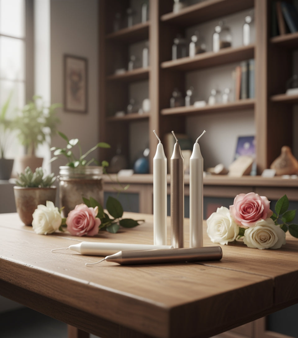 2 Metallic White Ritual Candles – Crown Chakra aligned, bringing purification, spiritual clarity, and divine connection