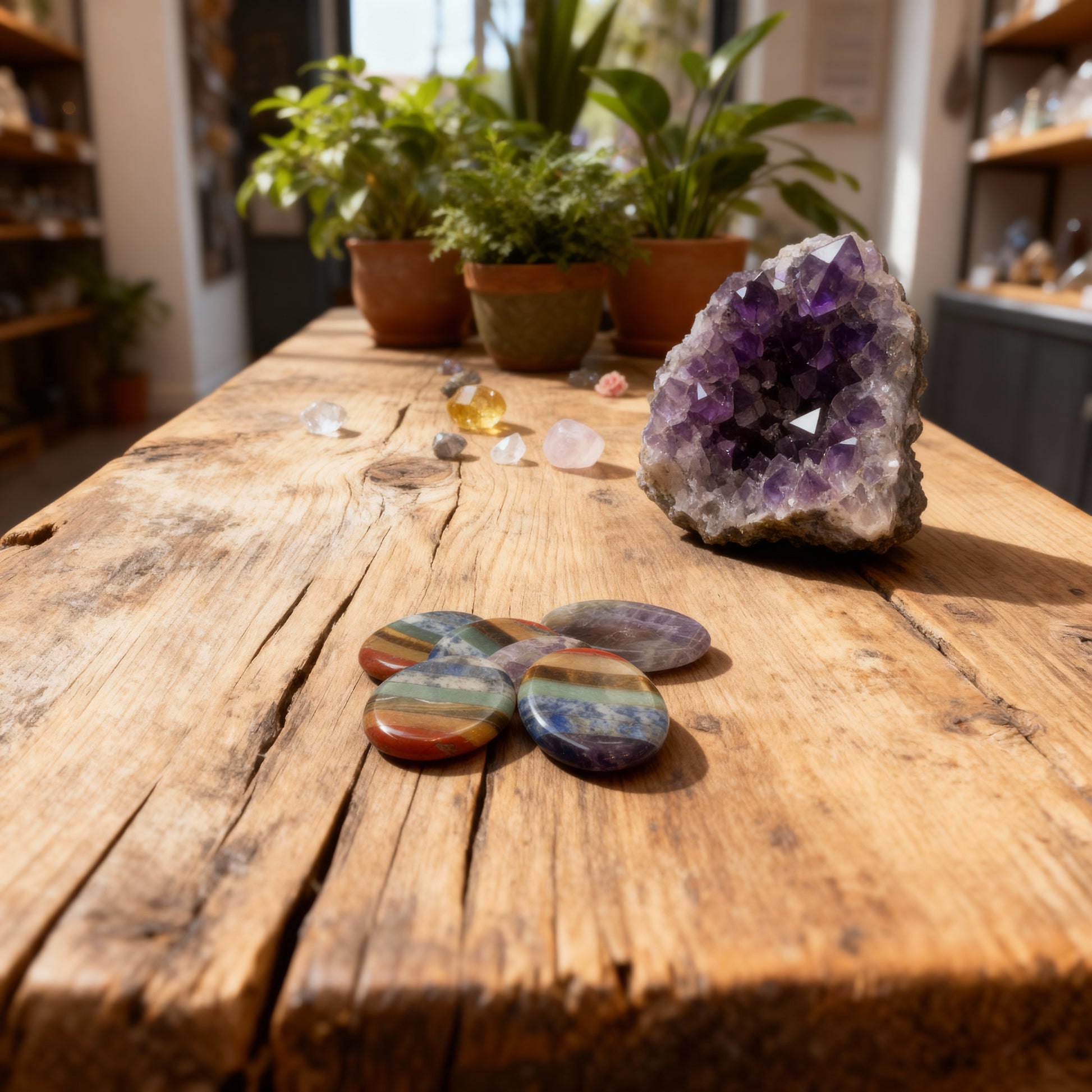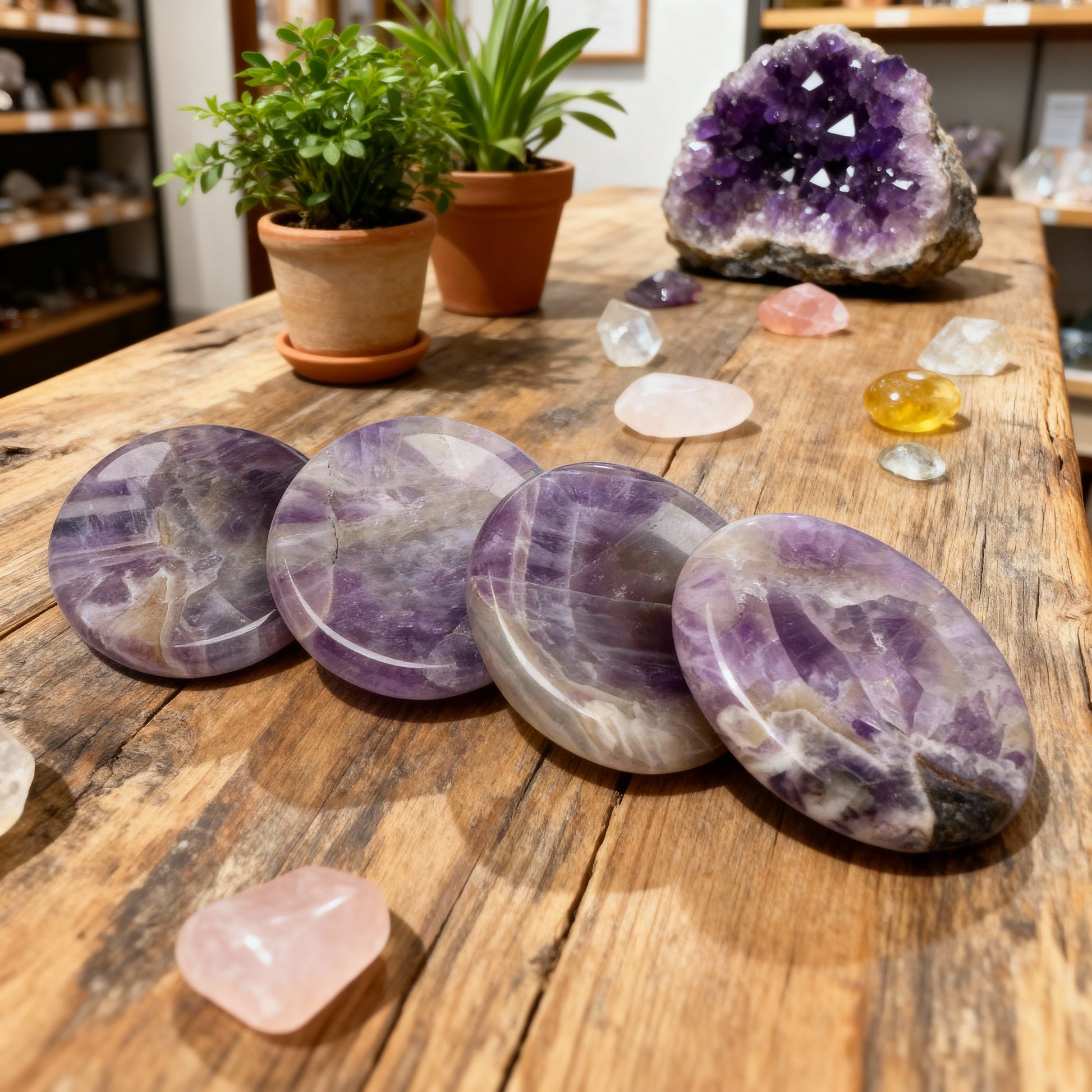 Sit comfortably with your Sacred Geometry display positioned before you. Hold the Amethyst palm stone in your left hand or both hands, close your eyes, and breathe slowly. Visualize a soft violet light expanding from your heart outward, clearing your field and quieting the mind. Allow impressions, sensations, or intuitive insights to arise naturally. Conclude with a silent expression of gratitude before returning to your day.