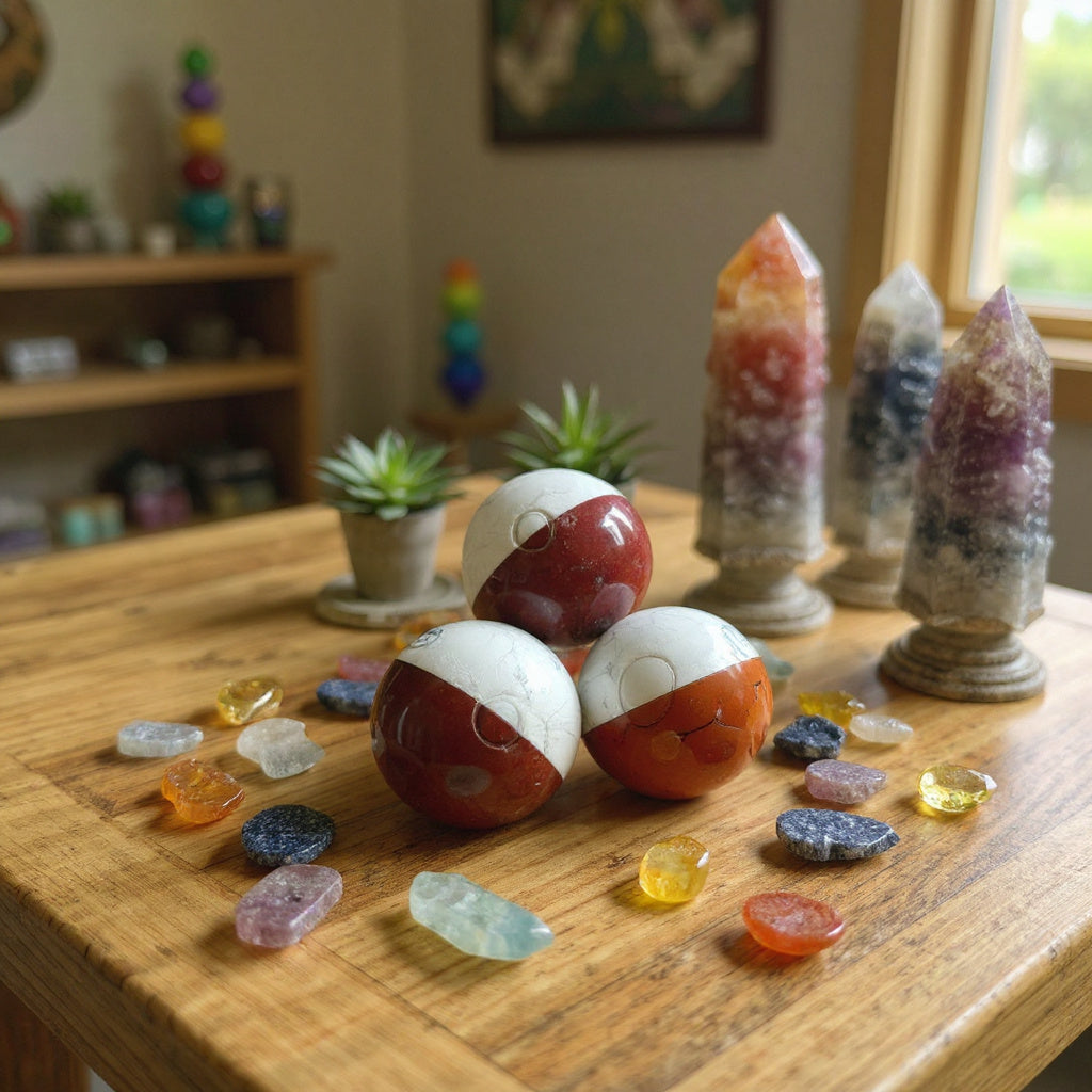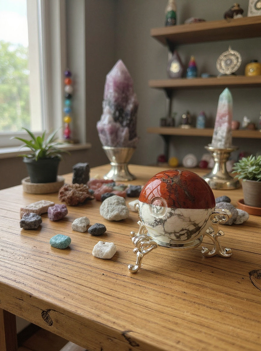 Step into a world where childhood dreams meet ancient crystal wisdom. Our handcrafted Pokémon-inspired crystal balls are a stunning blend of Red Jasper and Howlite, carefully shaped into a collectible 40mm Pokéball sphere. Whether you’re a spiritual seeker, a Pokémon enthusiast, or looking for the perfect one-of-a-kind gift, this piece brings a playful yet powerful energy to any collection or sacred space.