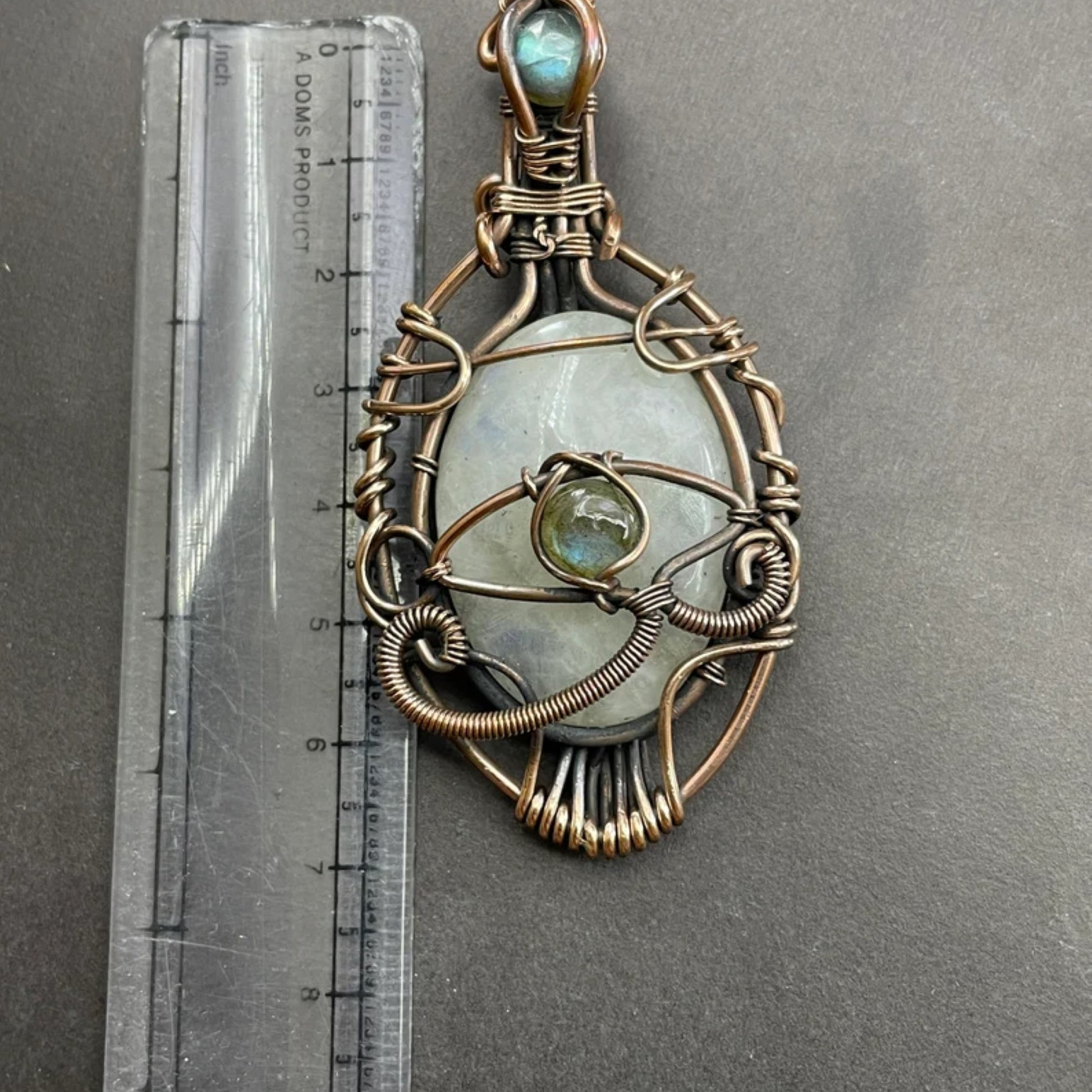 Introducing a wearable work of art that captures the ethereal beauty of the cosmos itself. Our Handmade Rainbow Moonstone and Labradorite Copper Pendants are crafted with love and passion. Each is unique and no two are alike. This pendant is designed to transport you to a world of enchantment. Wear this pendant as a timeless statement of your unique style. It's a versatile piece that can complement both casual and formal outfits, adding a touch of mystique to your look.
