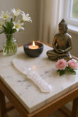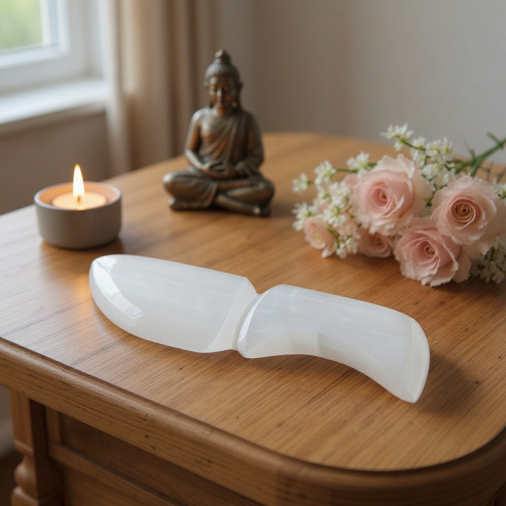 Harness the Selenite Dagger’s pure energy in Reiki sessions to amplify healing and flow: Hold the dagger in your dominant hand, setting an intention for cleansing and protection. Gently wave it over the recipient’s body or chakra points, starting from the crown and moving downward, visualizing white light clearing blockages and infusing vitality. For self-healing, place the tip on affected areas while channeling Reiki energy, allowing its vibrations to dissolve negativity and restore balance. Recharge by placing it in moonlight, ensuring it’s ready for your next session and drawing you back to our store for more Reiki-enhancing tools.