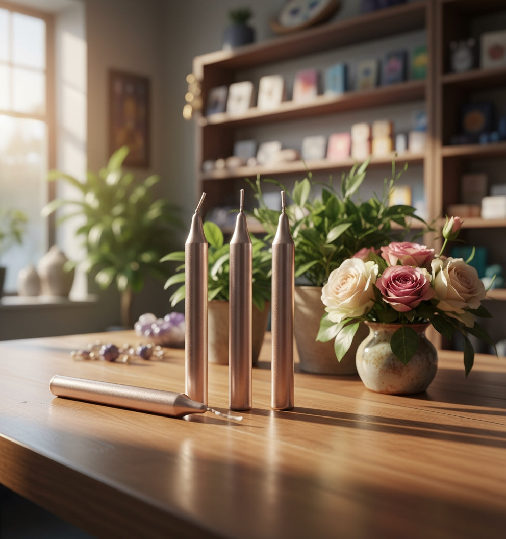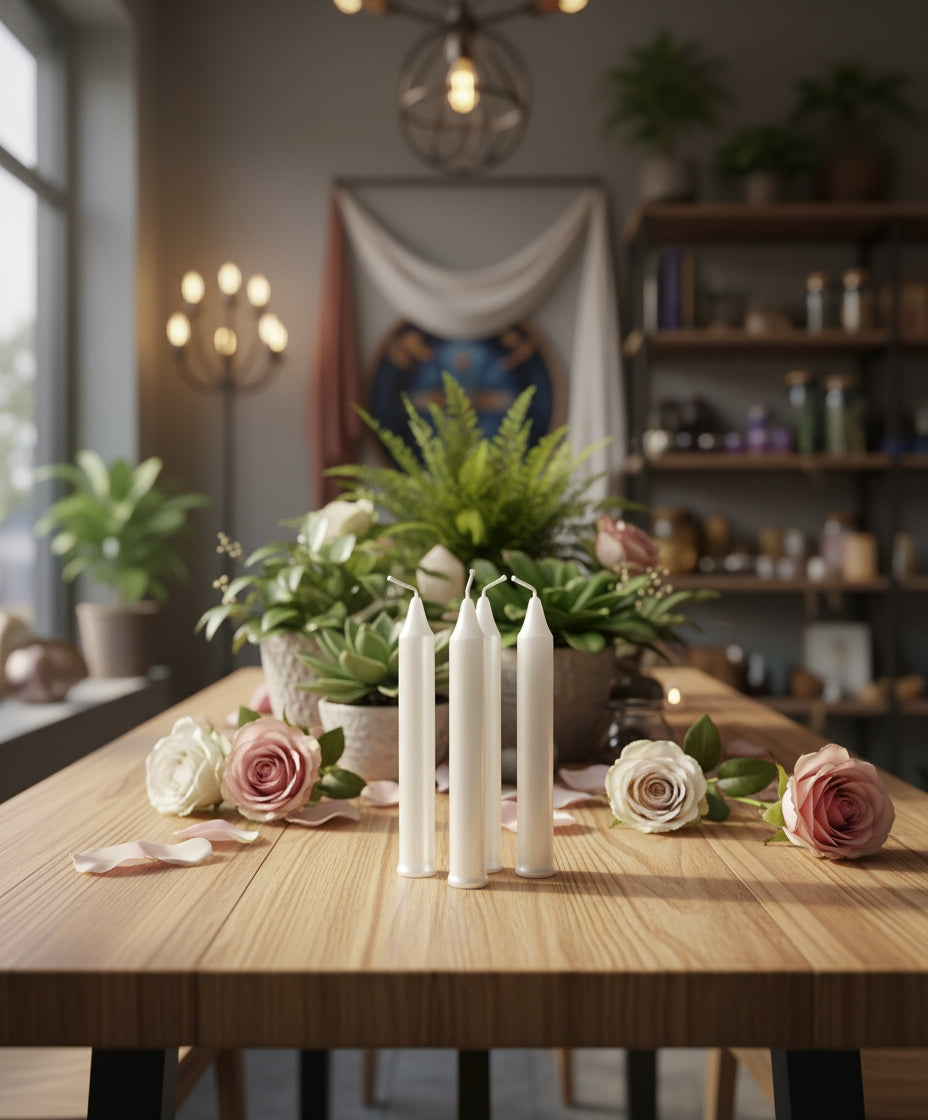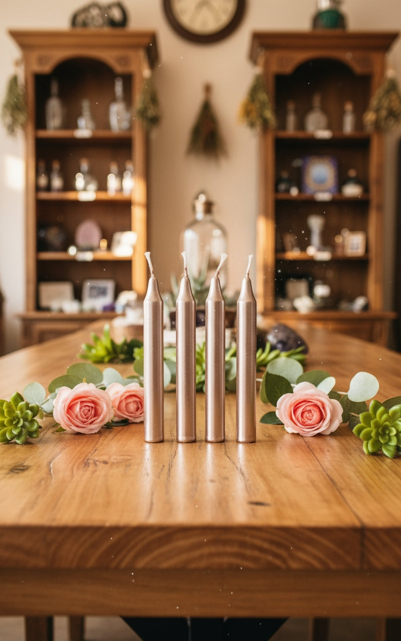 write a clear intention or carve a keyword or sigil, optionally anoint with a compatible oil, and place in a snug chime holder on a heat-resistant surface. Pair Rose Gold to open doors and draw harmony; follow with White to clarify, protect, and seal your result. Repeat the sequence on aligned days to reinforce the work.