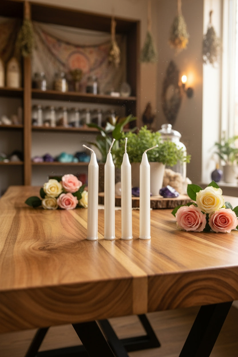 Associated with lunar purity, peace, and fresh beginnings. A classic stand-in for any color when you need a clean slate, balancing mind and space, amplifying prayers, meditation, dreamwork, and gentle protection. Light to reset energy before important conversations, to purify a room, or to invite calm focus.