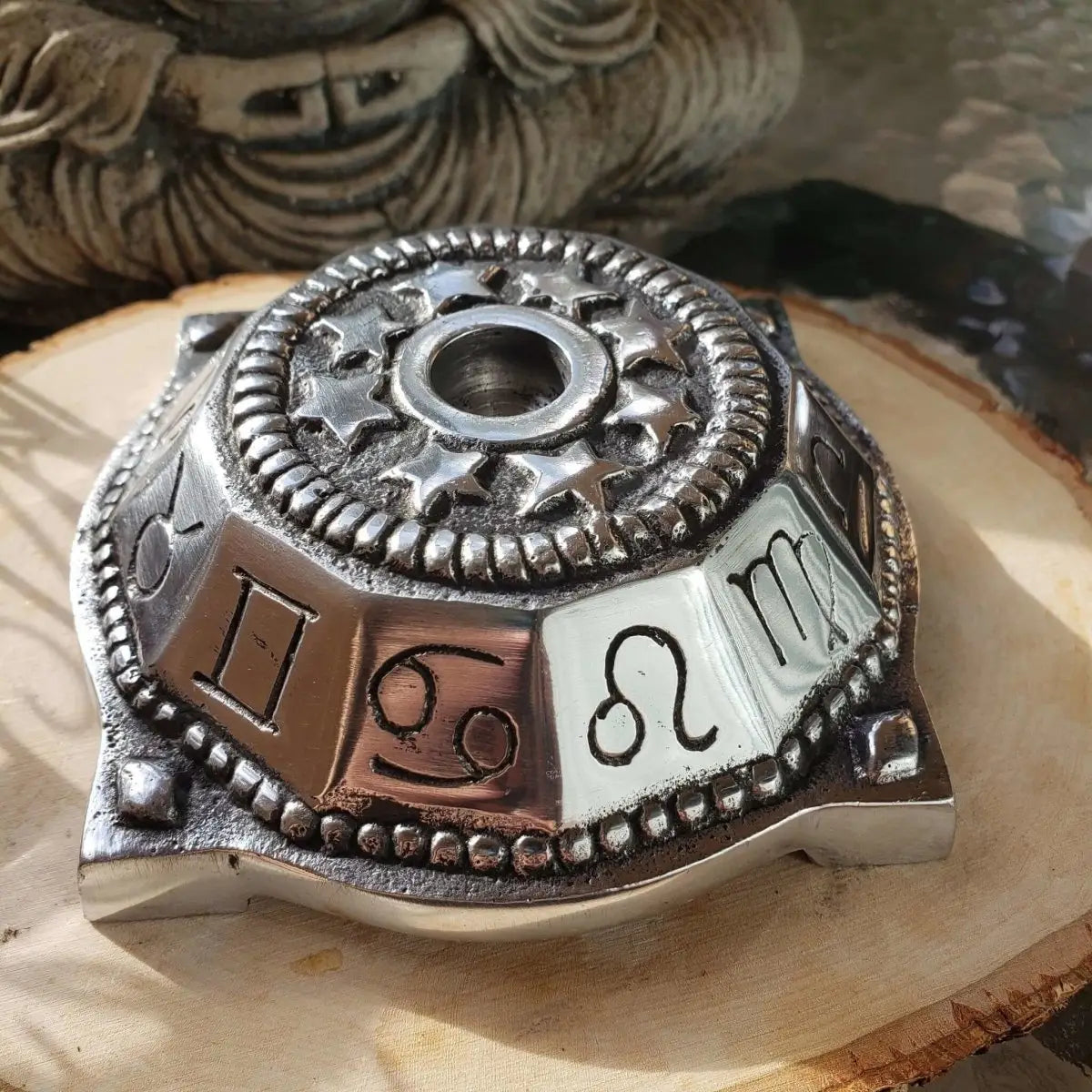 Designed to hold small taper candles or chime candles, this metal holder features a circular base beautifully etched with the twelve zodiac signs, each one delicately represented with celestial motifs. Whether you're lighting a candle for ritual, intention-setting, or ambiance, this holder brings a sacred presence to your space by anchoring your light in the language of the stars.